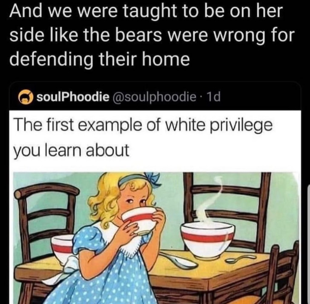 As the meme below says, Goldilocks is “the first example of white privilege you learn about.” Ember sort of feels like she has snuck her way into this job interview with subversively wielded white privilege. So, maybe subconsciously she’s thinking of Goldilocks sneaking into the bear family’s house as she heads for this shiny office building.