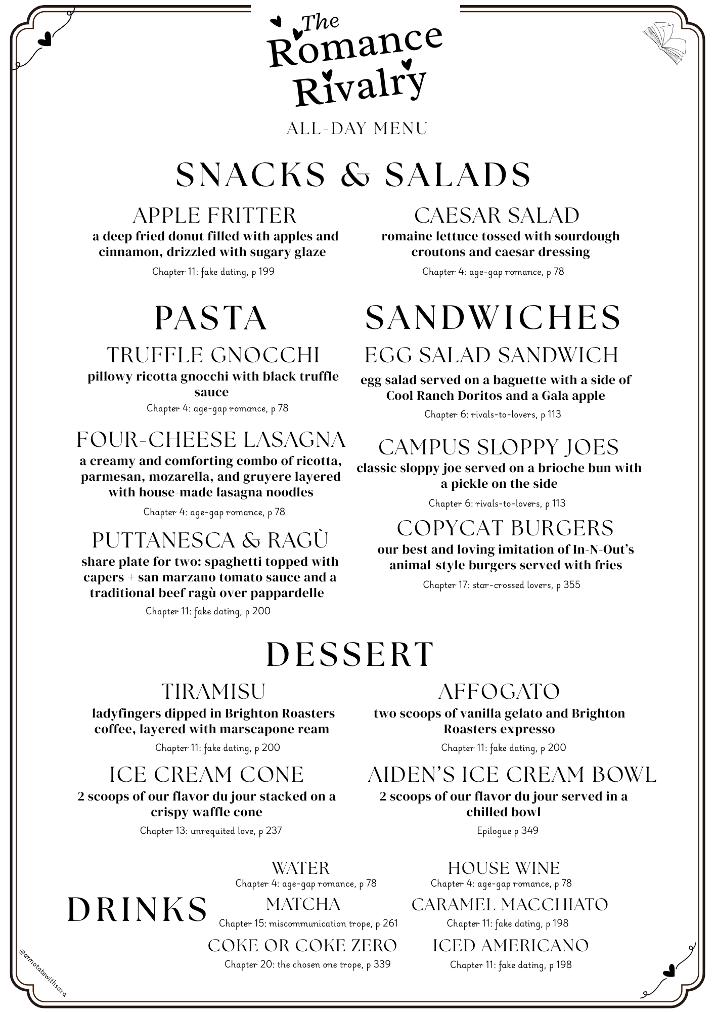 - EGG SALAD SANDWICH, COOL RANCH DORITOS, APPLE: Chapter 6: rivals-to-lovers, p 113